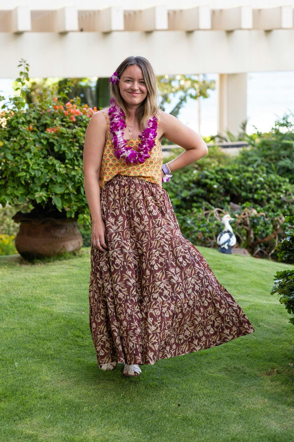 Crafted from 100% lightweight cotton, this skirt features intricate, hand-stamped patterns created by skilled artisans in India. The flowing design and elastic waistband offer a flattering, adjustable fit that’s both stylish and comfortable. This skirt comes in one size. The one size waistband stretches from 24"-38".