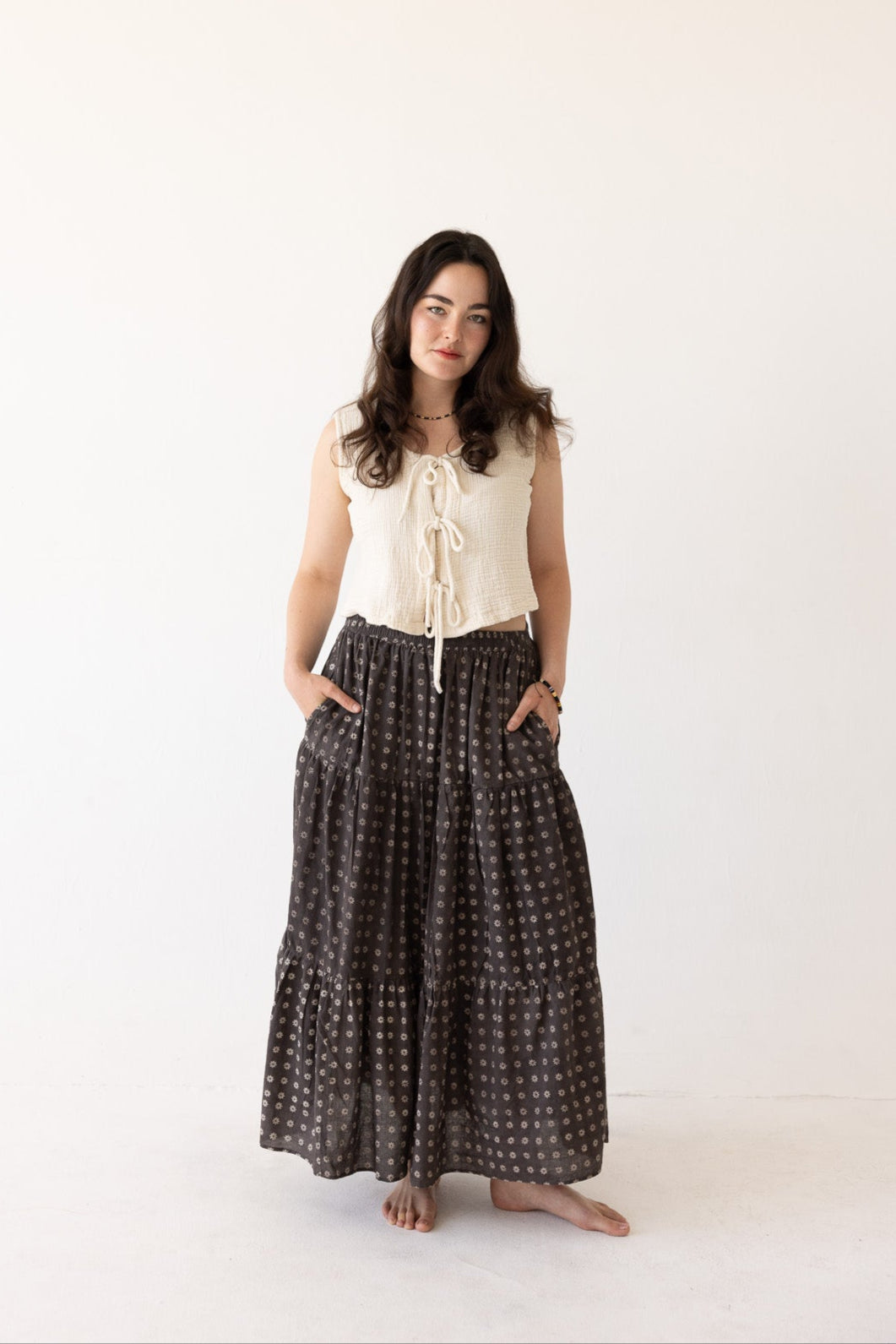 Crafted from 100% lightweight cotton, this skirt features intricate, hand-stamped patterns created by skilled artisans in India. The flowing design and elastic waistband offer a flattering, adjustable fit that’s both stylish and comfortable. This skirt comes in one size. The one size waistband stretches from 24"-38".