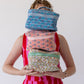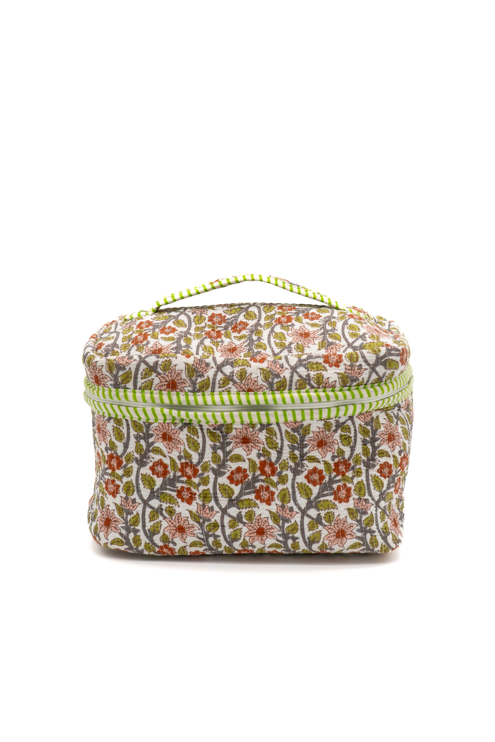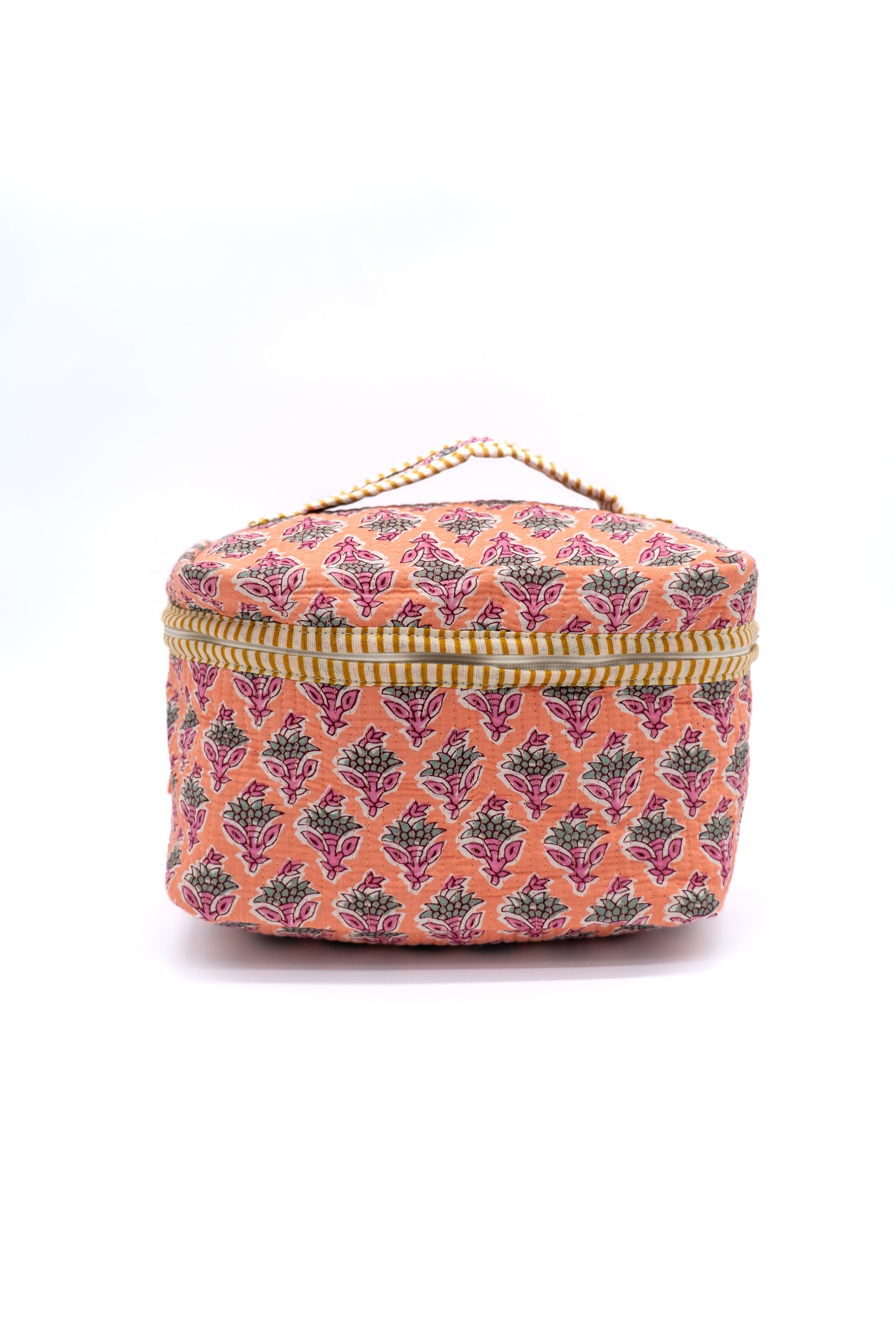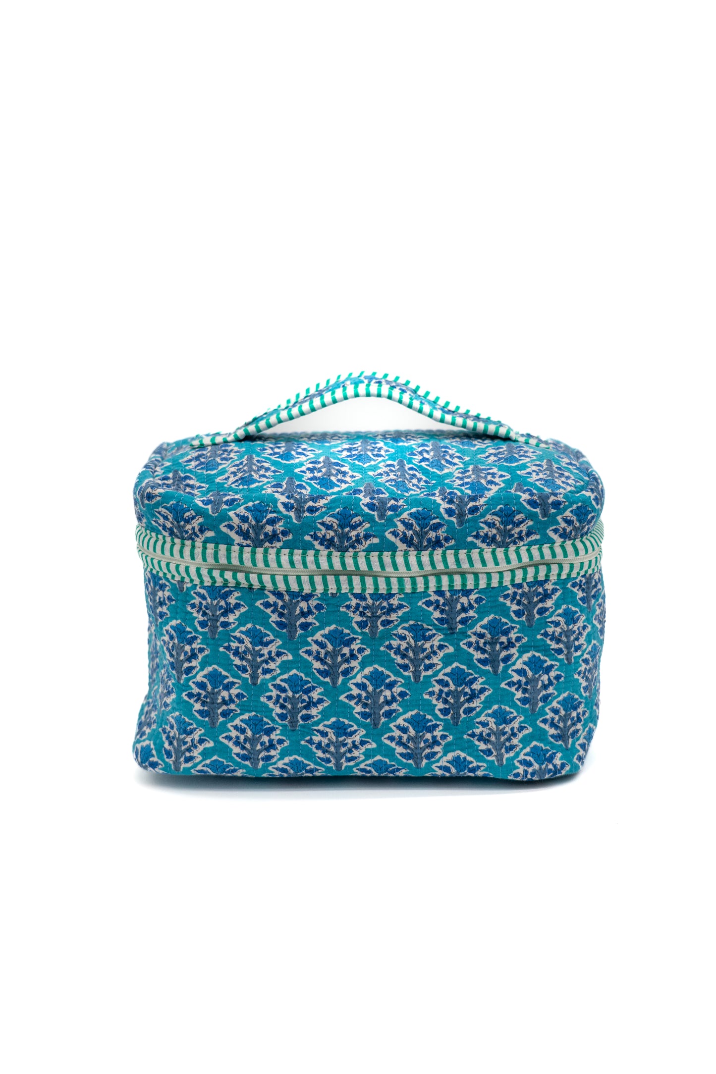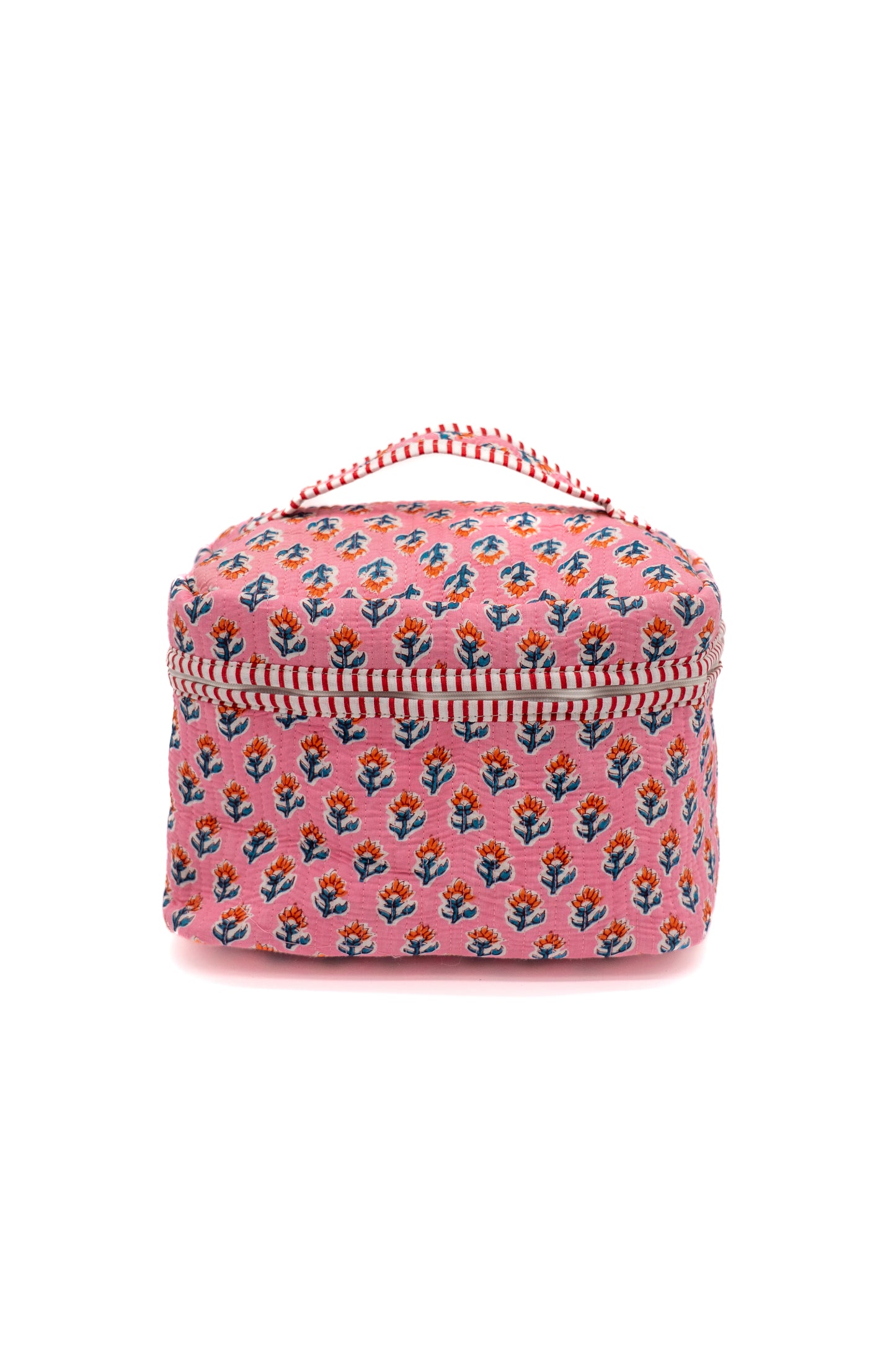 Spacious, soft, and beautifully block printed, this quilted makeup bag is made from thick cotton and finished with a playful tassel zipper pull. Fully lined with an interior pocket to keep small items in place. The structured shape makes it easy to pack or display on your counter. Available in six of our signature prints to match your tote, sling, or bucket hat.